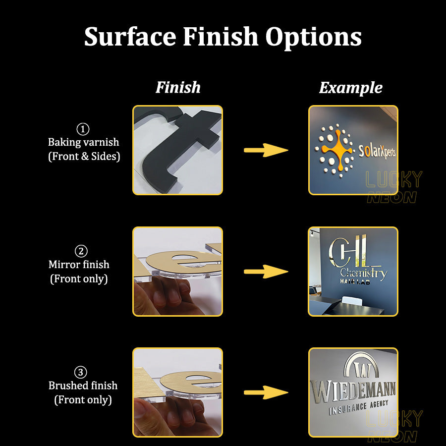• Letters Finish Options: Brushed, mirror, or spray painted (matte finish)